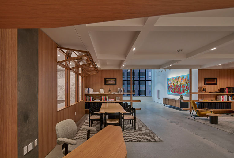 Transparent private offices are in the project’s core while open workspaces surround the building perimeter creating an egalitarian bright work area filled with natural light and views of the city skyline. The architecture, with its clean, simple lines, and elegantly detailed office fronts trimmed in white oak, lends itself as the ideal backdrop to the client’s impressive art collection. It is complemented by the circulation spaces, which double as curated fine art galleries.